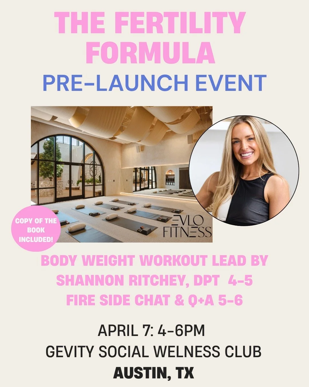 Join Natalie Crawford, MD and Dr. Shannon Ritchey to celebrate the launch of The Fertility Formula with a special workout class hosted by Evlo Fitness and early access to The Fertility Formula, hosted at Gevity Club.